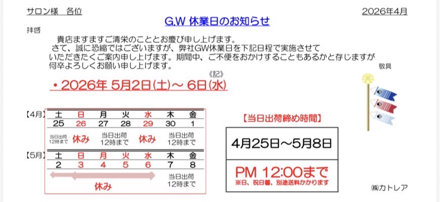 さて、誠に勝手ながら下記の期間をゴールデンウィーク休業とさせていただきます。